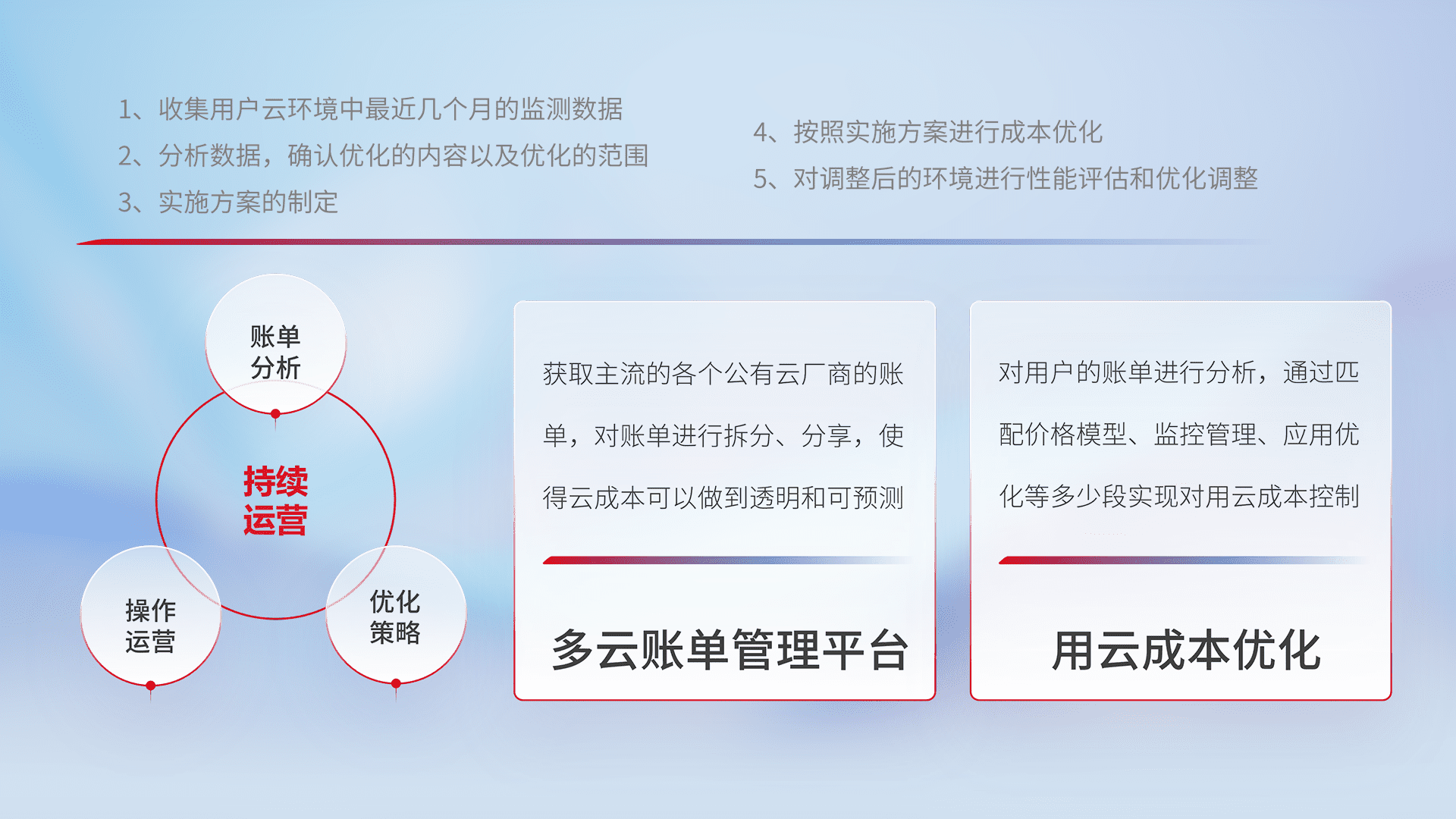 通过多云纳管,,以统一的资源数据模型把客户的云资源进行抽象和封装,,,进而实现对多云资源的统一操作,,,保障云资源管理的可靠性、、稳定性与可用性。。。量身定制化运维内容,,,配置、、、、开发运维、、、补丁管理、、备份、、、、监控、、、认证和访问管理、、、、审计和日常巡检等,,,,保障在用云过程中的可靠度,,,,稳定度以及高可用率。。。
